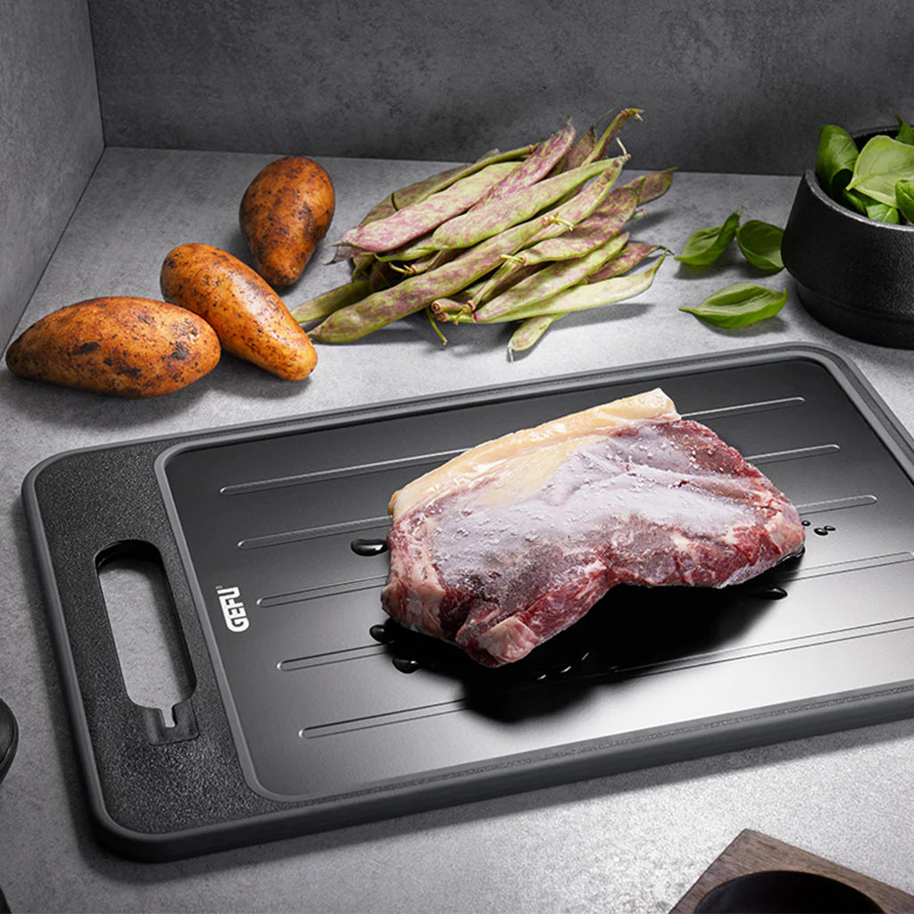 La tabla de descongelación rápida funciona gracias a un material con alta conductividad térmica en aluminio que transfiere el calor del ambiente directamente a los alimentos congelados. Esto permite que la carne, el pollo o el pescado se descongelen hasta cuatro veces más rápido que sobre una superficie común, sin necesidad de electricidad, microondas ni agua caliente